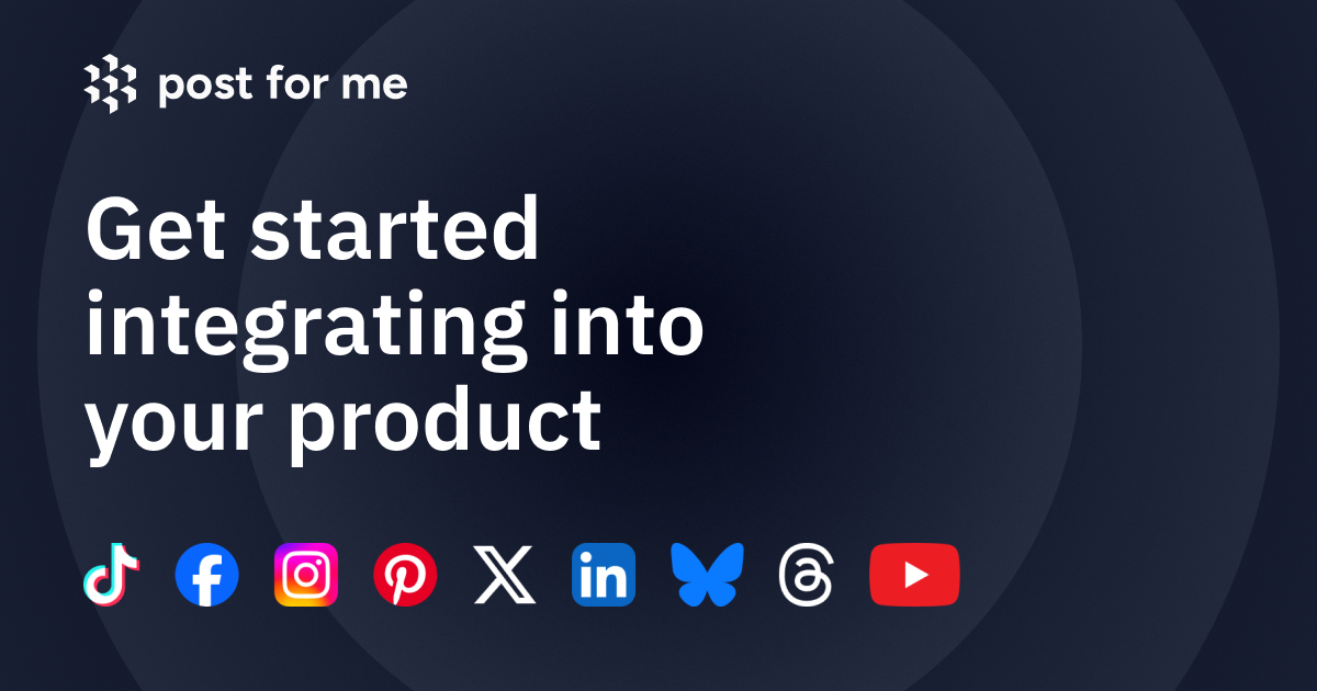 Post for Me is the unified developer API that simplifies social media integrations. Post and schedule content to TikTok, Instagram, Facebook, YouTube, X (Twitter), LinkedIn, Threads, Pinterest, and Bluesky with one simple REST endpoint. Handle OAuth, media processing, feeds, analytics, and webhooks effortlessly—no more platform-specific headaches or months of custom code.
